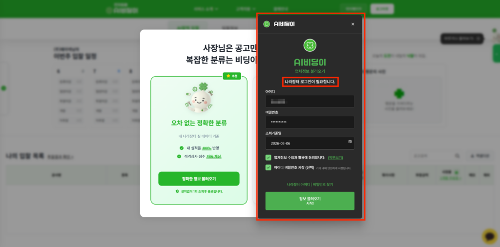 - 나라장터(G2B) 정보: 나라장터 접속 아이디와 비밀번호가 필요합니다.