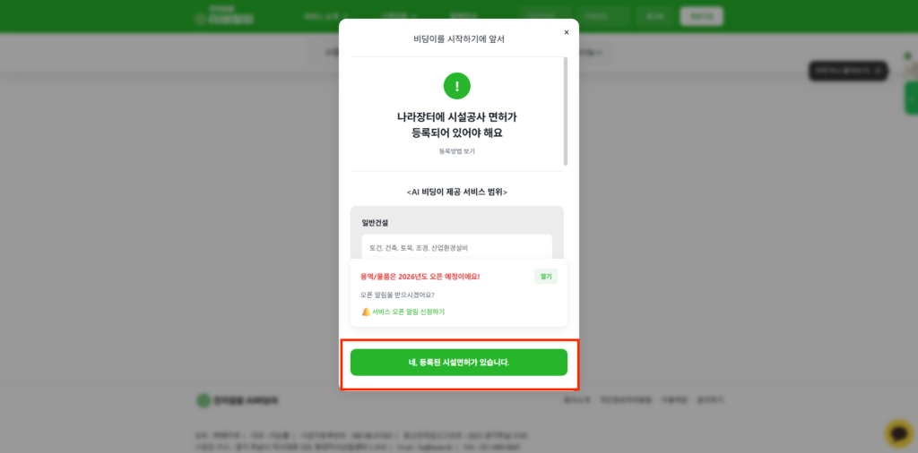 - 면허 확인: 현재 ‘시설공사(일반/전문/기타건설)’ 면허 보유 업체만 가입이 가능합니다.