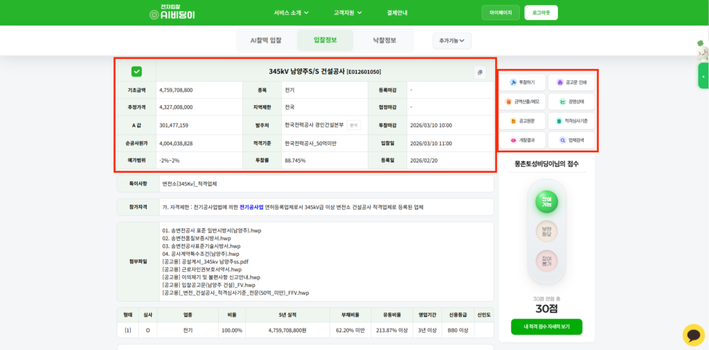 공고 상세 화면은 복잡한 적격심사 점수 계산을 AI가 대신해 주어, 실무자가 머리 아프게 기준표를 뒤질 필요 없이 ‘진짜 투찰 가능한지’ 1초 만에 판단할 수 있게 해줍니다. 점수 분석과 협정 업체 탐색이 끝났다면 이제 투찰을 진행해야겠죠?