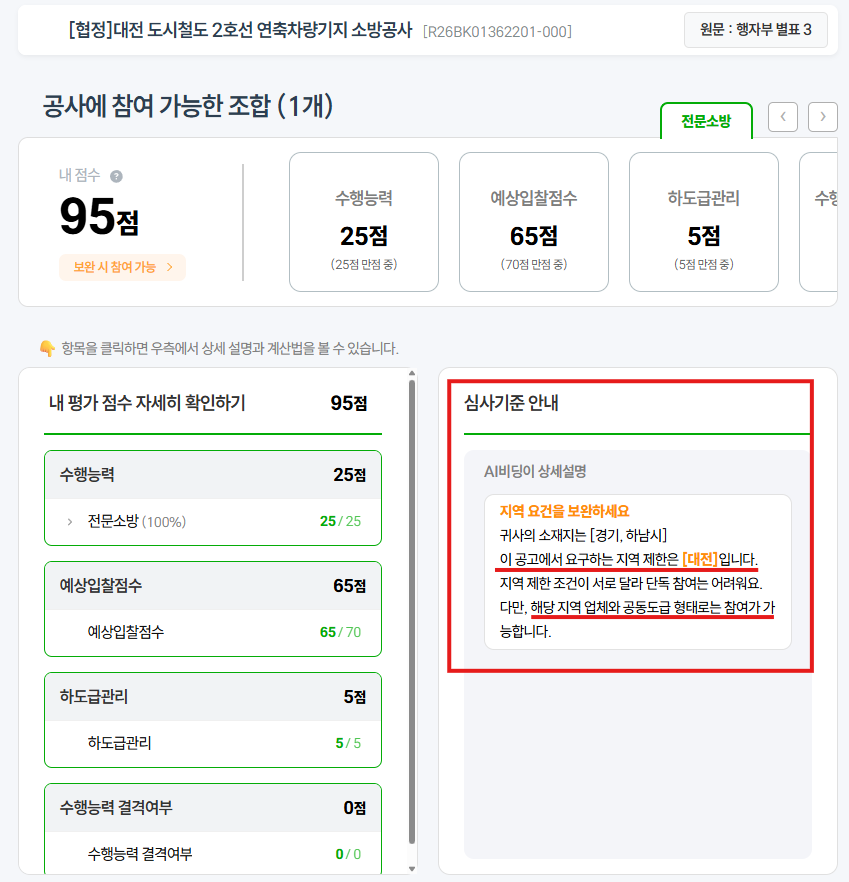 ‘보완 필요’의 진짜 의미: 신호등에 주황색이 떴다고 해서 입찰 자체가 불가능하다는 뜻이 아닙니다. 단독으로 들어가면 점수가 깎이니 타 업체와 공동도급(협정)을 맺어 점수를 채우라는 뜻입니다.