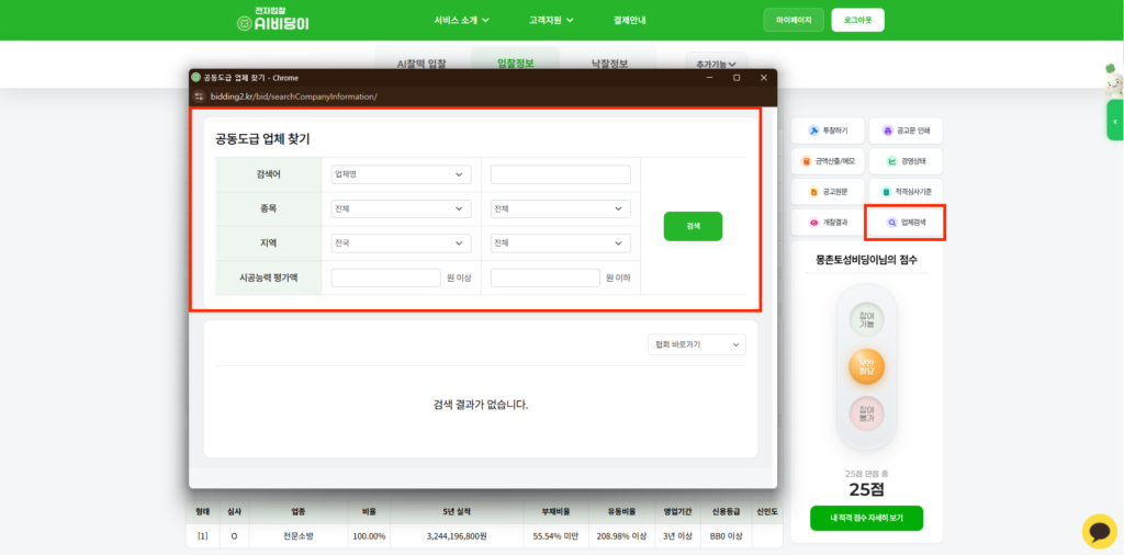 상세 점수 보기에서 부족한 조건을 파악했다면, 화면 우측 상단의 [업체검색] 버튼을 클릭합니다.