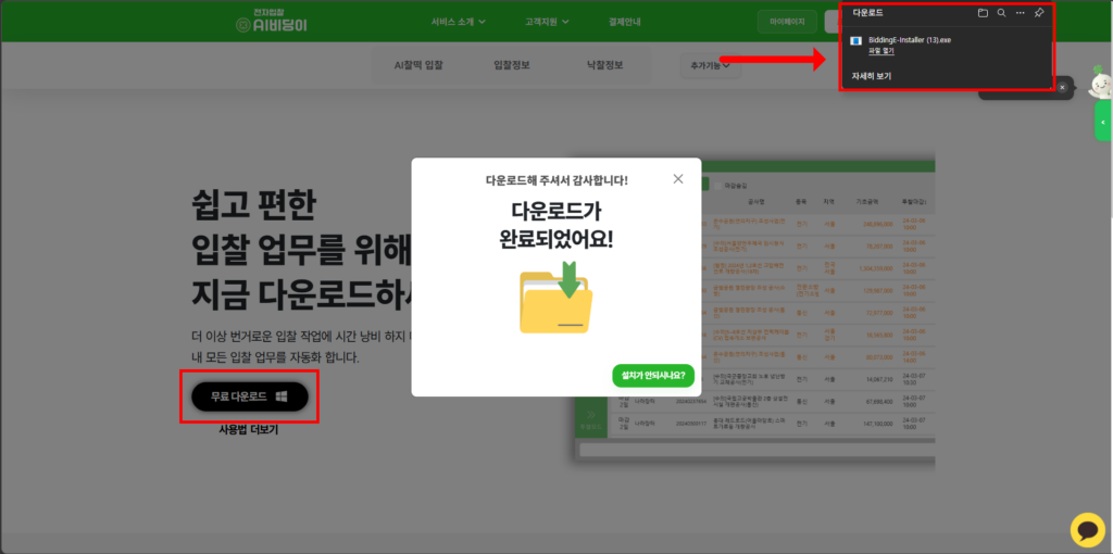 3. 브라우저 우측 상단 다운로드 내역에서 BiddingE-Installer.exe