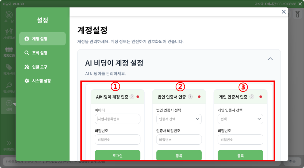 | ① AI비딩이 계정 인증 (필수) | AI 비딩이 홈페이지 계정 |