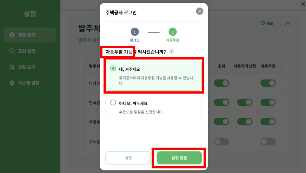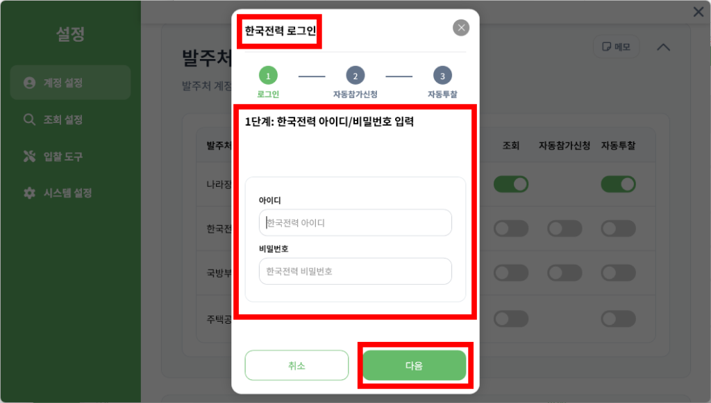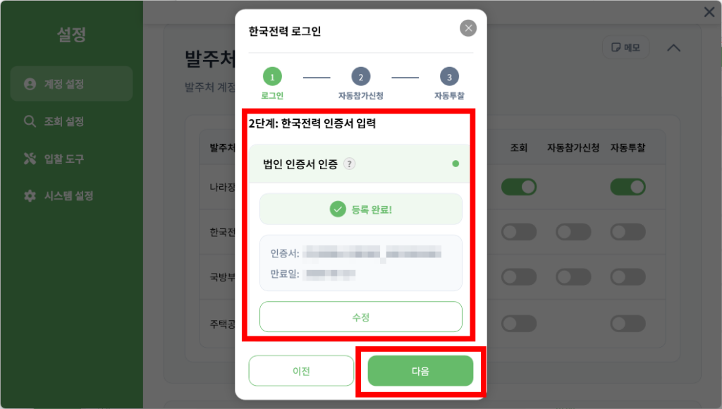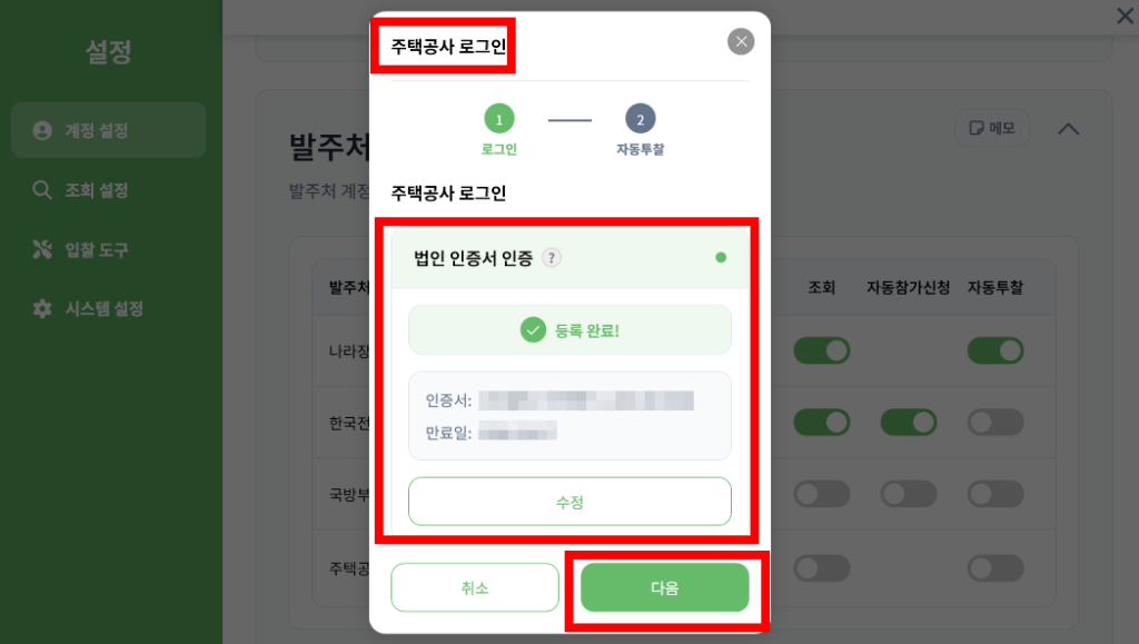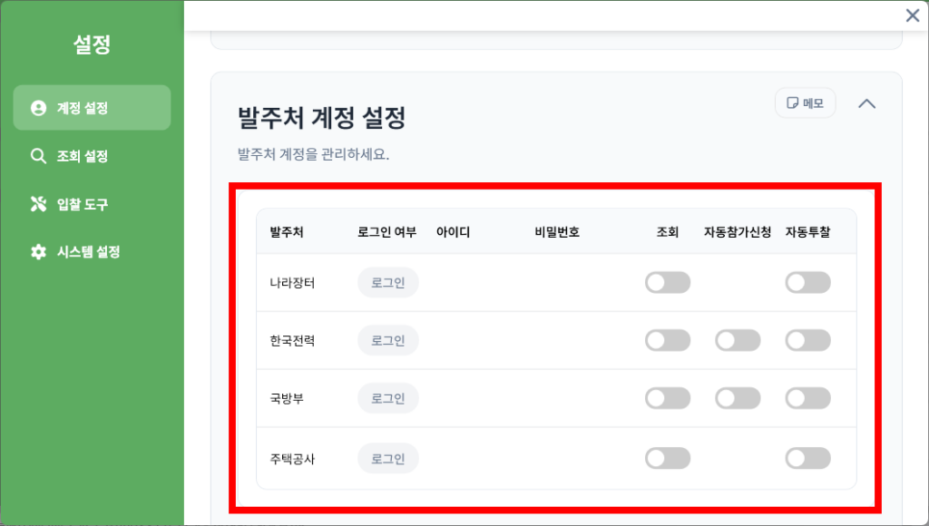 그리고 입찰에 필요한 각 발주처 로그인 연동까지 기초 설정이 모두 완벽하게 끝났습니다.