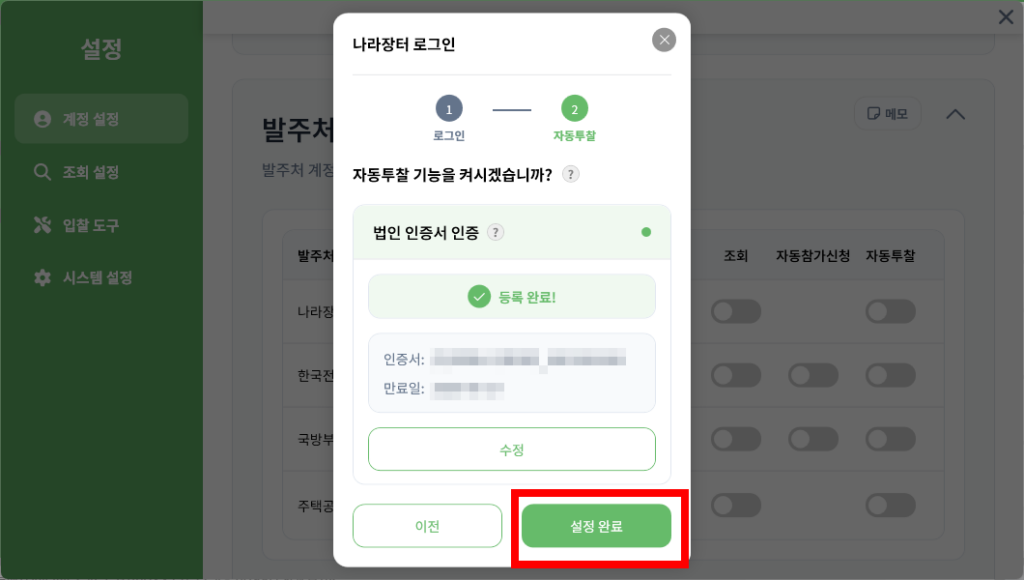 하단의 [설정 완료] 버튼을 누르면 나라장터 연동이 최종 완료됩니다.