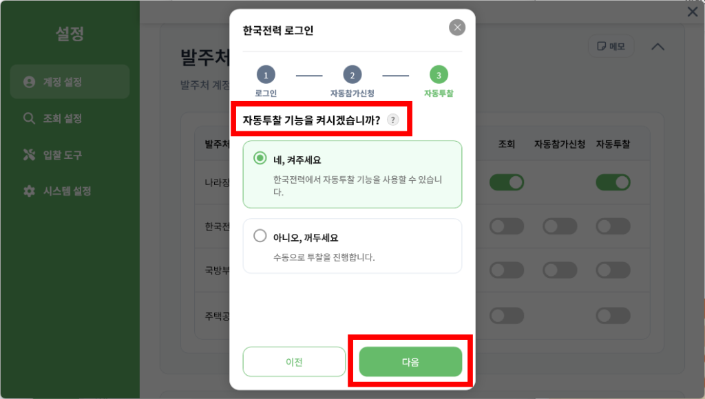 - 명의 불일치 주의: 한국전력/국방부에서 자동투찰을 사용하려면 반드시