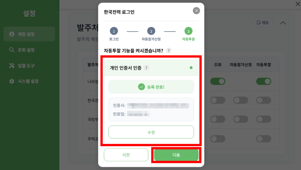 이를 위해 최초 1회 비딩이 계정과 입찰용 인증서, 그리고 각 발주처 계정을 연동해 두는 필수 기초 작업입니다